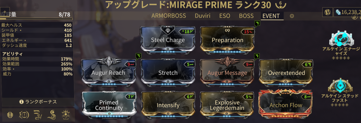 攻撃を食らう要素はほぼ無いので、耐久力に関連するMODは積まず、最初からアビリティをフルに使えるように「Archon Flow」+「Preparation」を積んでいます。