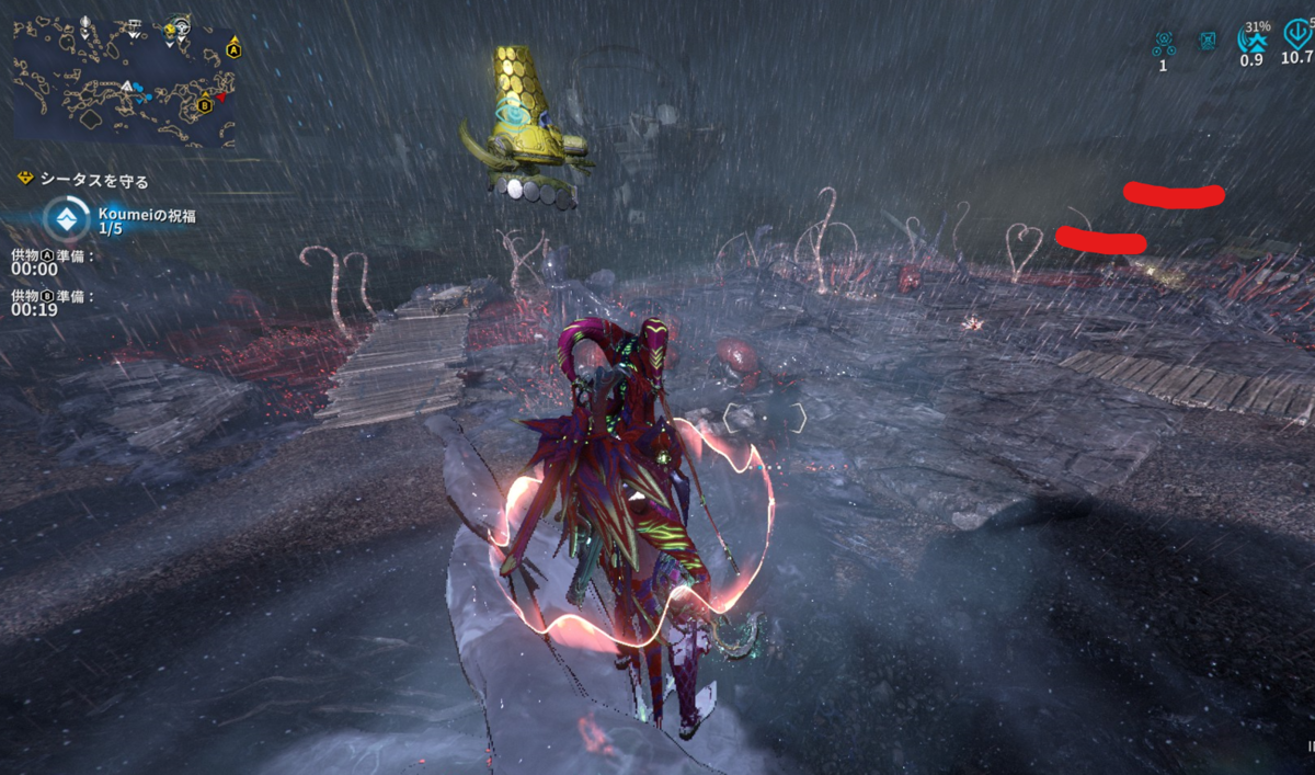 その後B地点も出るので、周囲の円の中に敵を入れないように駆逐してカウントが30秒→0秒になると、また供物が出るので運びましょう。